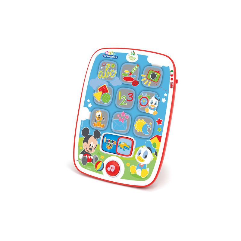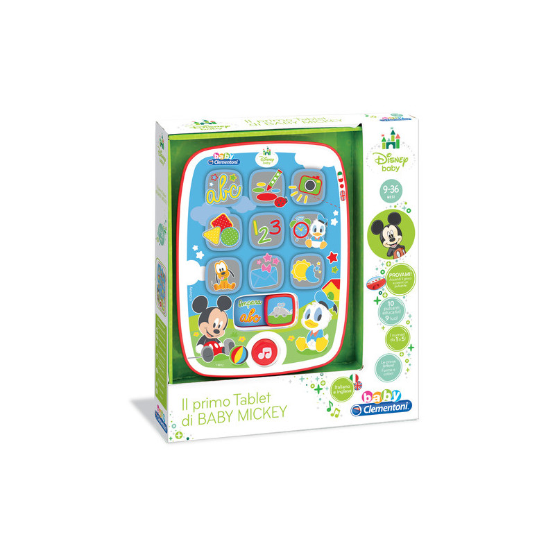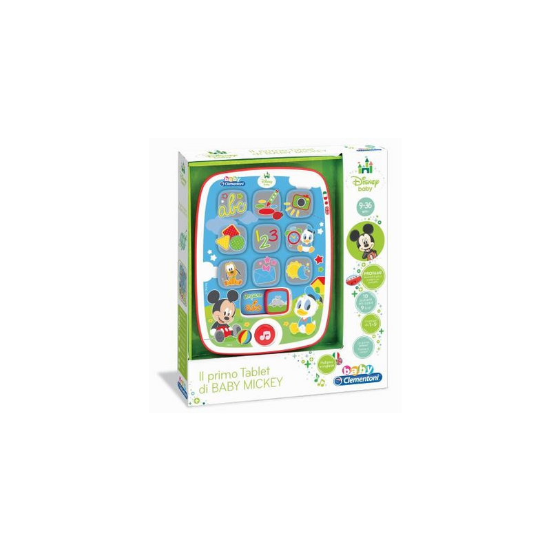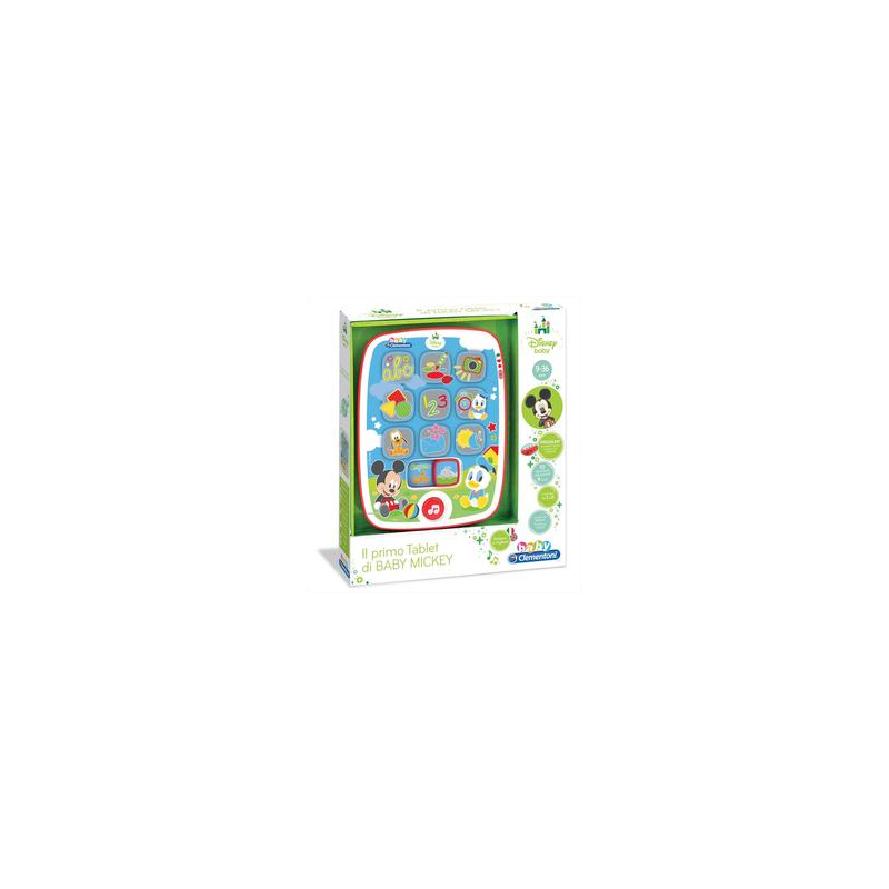 Clementoni Il Primo Tablet di Baby Mickey. Tipo di prodotto: Kids tablet, Colore del prodotto: Multicolore, Tipo di controllo: Pulsanti. Età consigliata (min): 0,9 anno/i, Genere consigliato: Ragazzo/Ragazza, Età minima: 9 mese(i). Tipologia alimentazione: Batteria. Larghezza imballo: 220 mm, Profondità imballo: 40 mm, Altezza imballo: 260 mm. Tipo di imballo: Scatola - .Clementoni Il Primo Tablet di Baby Mickey Il Primo Tablet di Baby Mickey - Giochi Elettronici Per Bambini.